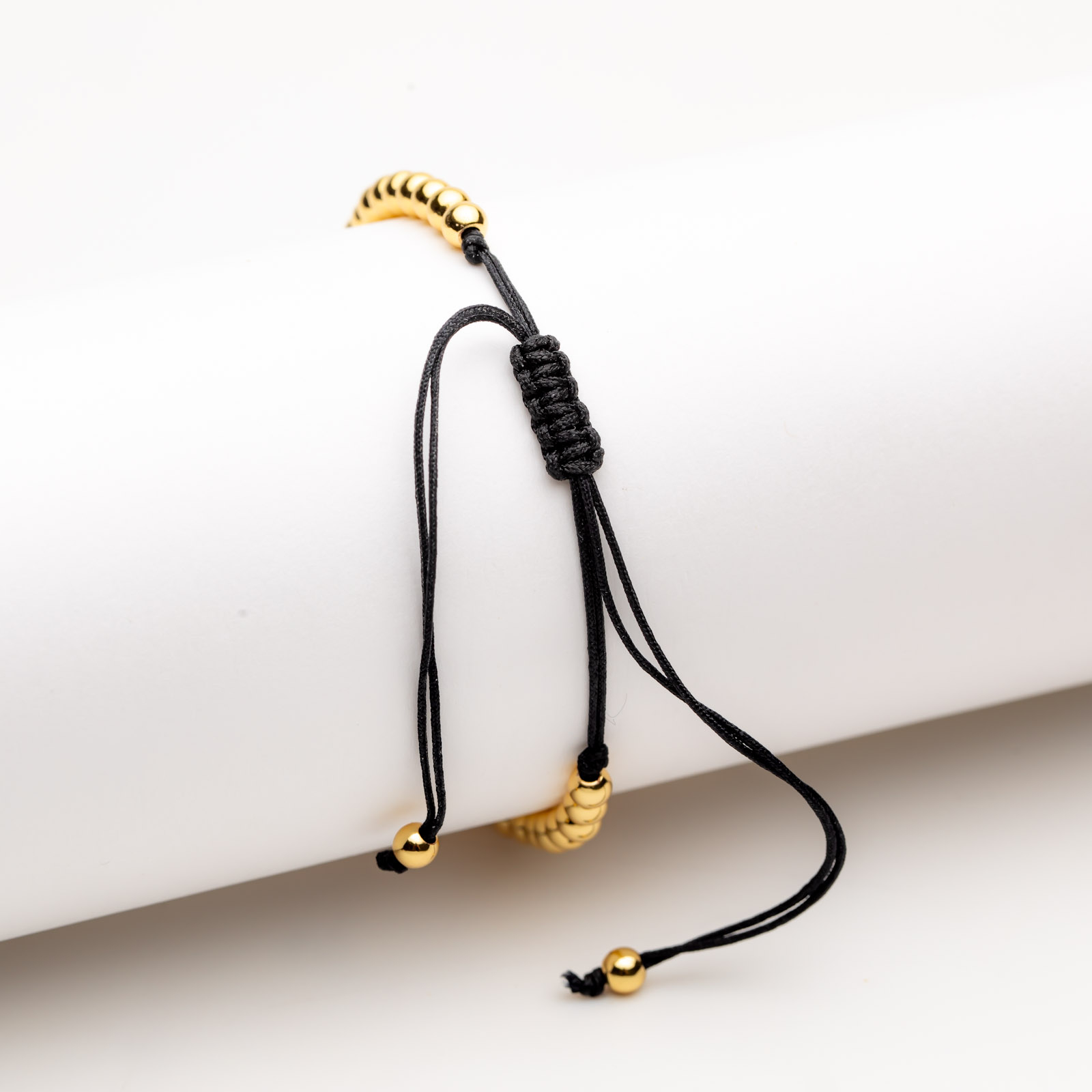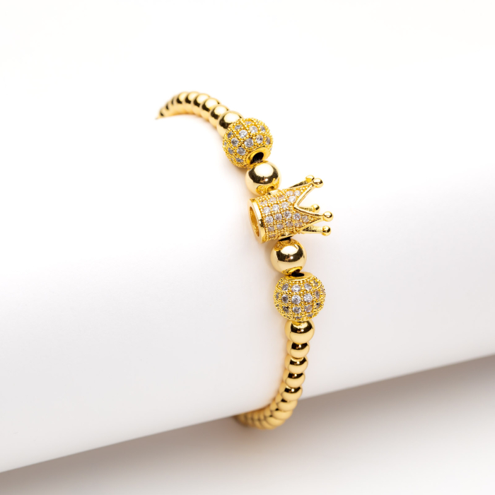 Brățară Aurie Reglabilă Cu Pandantiv Coroană Eliza - Eleganță Distinctă și Stil Plin de Rafinament - concepută din bile din aliaj metalic placate cu aur galben de 14 K, netede și rotunde, și 3 pandantive diferite (o coroană și două biluțe cu textură multifațetată). Pandantivele sunt acoperite cu cristale Zirconia transparente.