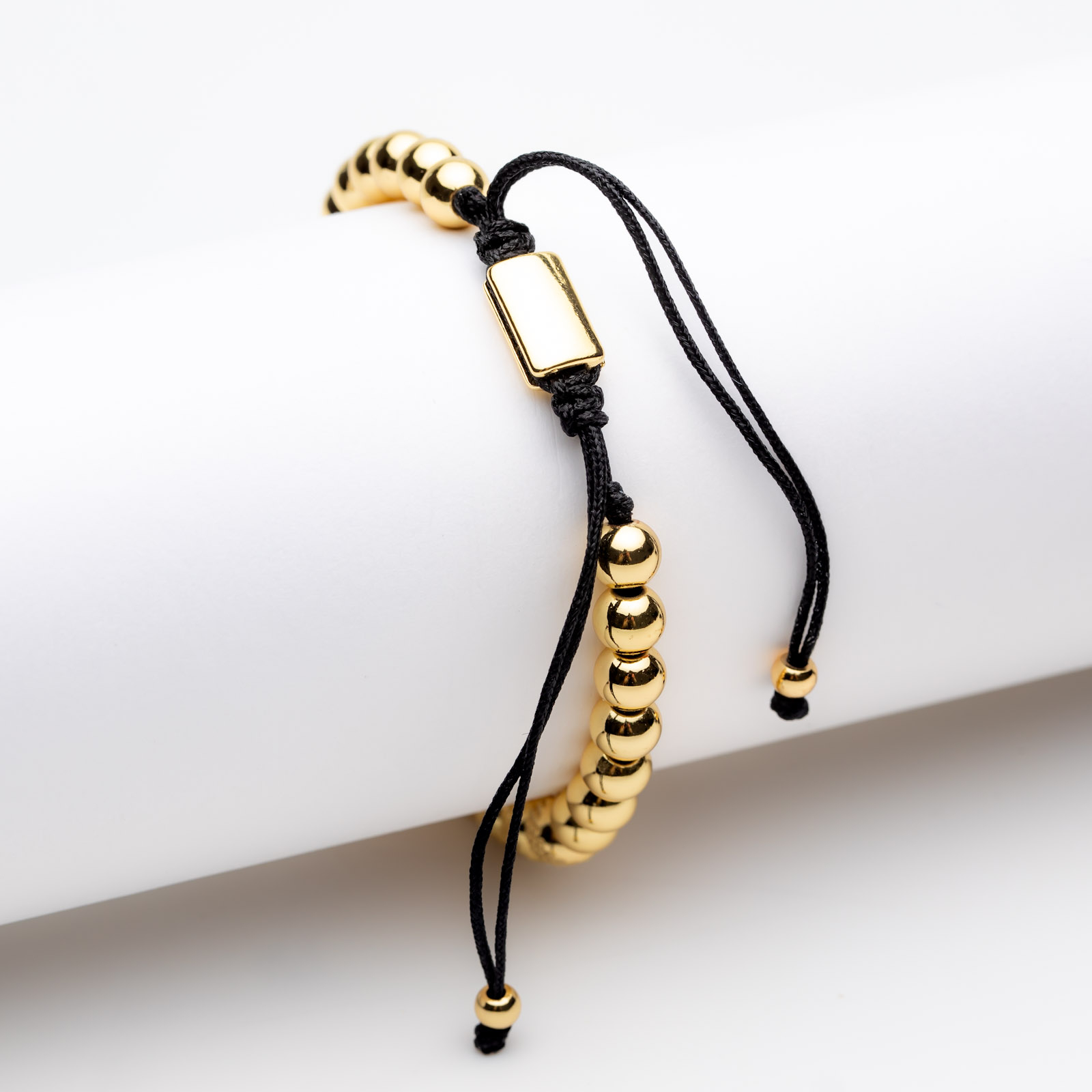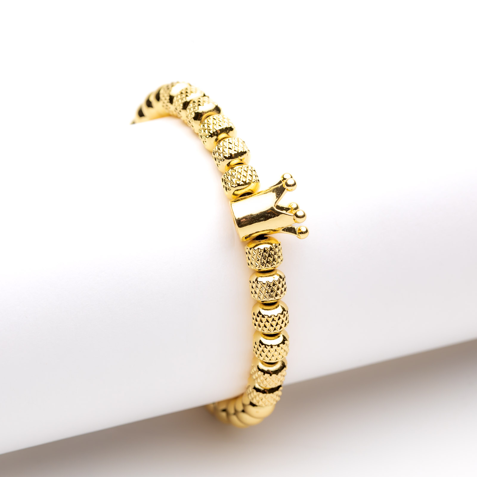 Brățară Aurie Reglabilă Cu Pandantiv Coroană Isabella - Noblețe În Tonuri Prețioase și Stil Desăvârșit - realizată din bile din aliaj metalic placate cu aur galben de 14 K, cu textură geometrică multifațetată, și pandantiv masiv și strălucitor, în formă de coroană.