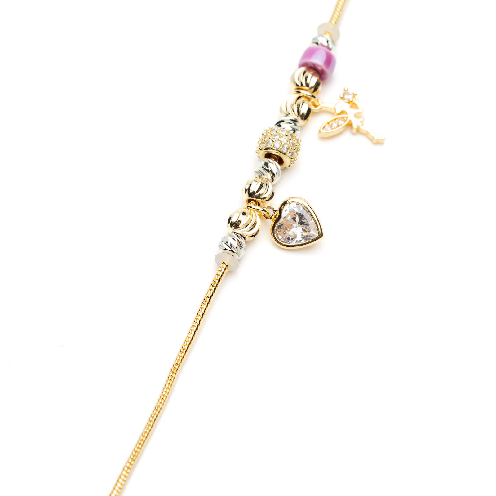 Brățară Aurie Tip Pandora Cu Charmuri Purple Fairy - Magie Colorată și Stil Efervescent - oțel inoxidabil placat cu aur galben de 14K, cu pandantive în formă de inimă decorată cu un cristal strălucitor și zână înfrumusețată cu detalii Zirconia, alături de bile metalizate și colorate.
