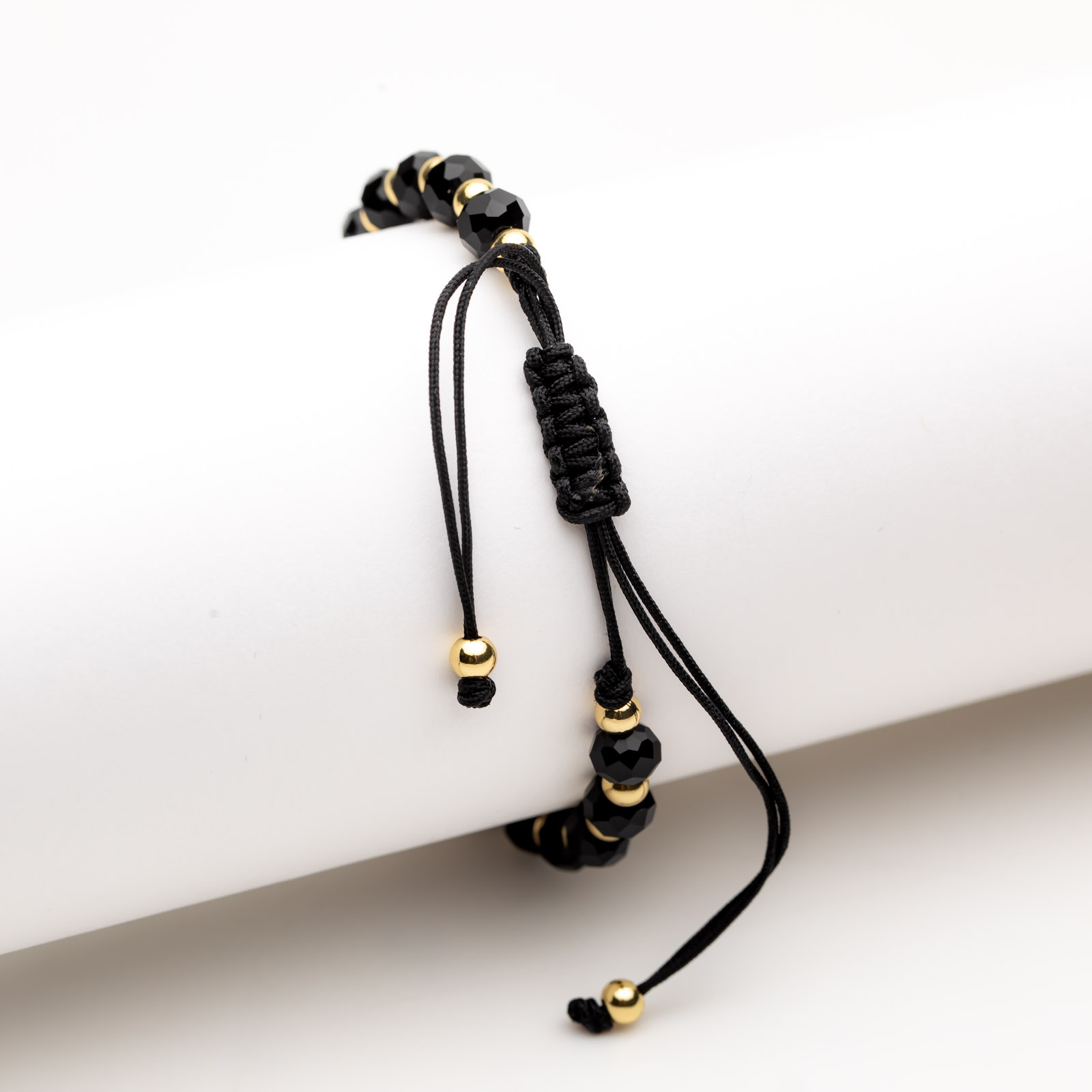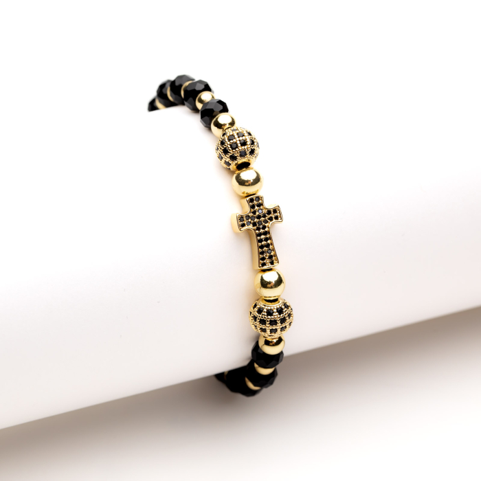 Brățară Reglabilă Handmade Cu Pandantiv Cruce Harmony - Grație Plină de Strălucire și Vibrații Spirituale - realizată din cristale negre multifațetate și bile placate cu aur galben de 14 K. Cele trei pandanrtive (o cruce și două biluțe decorative) sunt încrustate cu cristale Zirconia negre.
