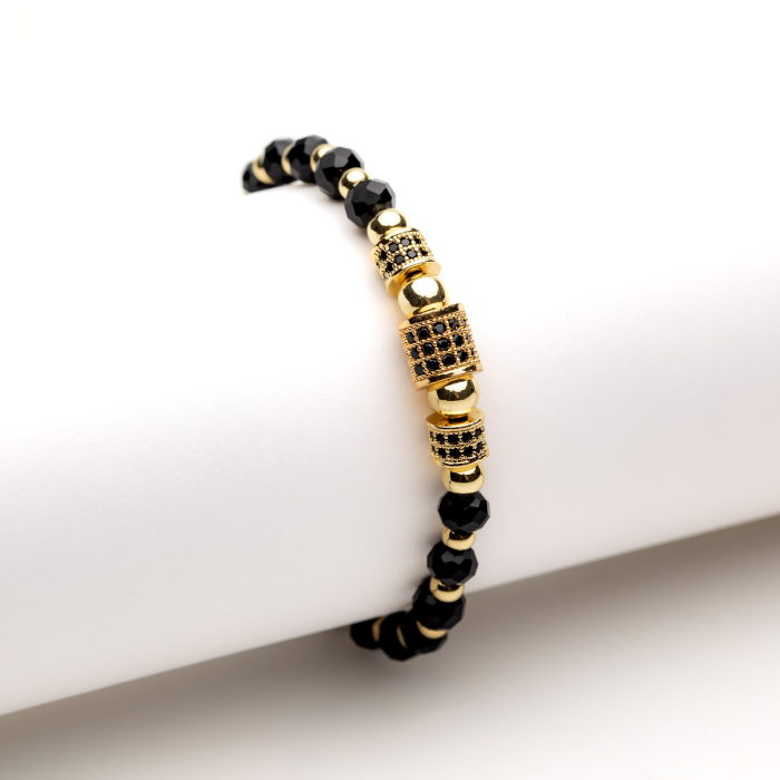 Brățară Reglabilă Handmade Cu Pandantive Black&Gold - Strălucire Rafinată și Look Super Versatil - realizată din cristale negre multifațetate și bile placate cu aur galben de 14 K. Cele 3 pandantive sunt încrustate cu cristale Zirconia de culoare neagră.