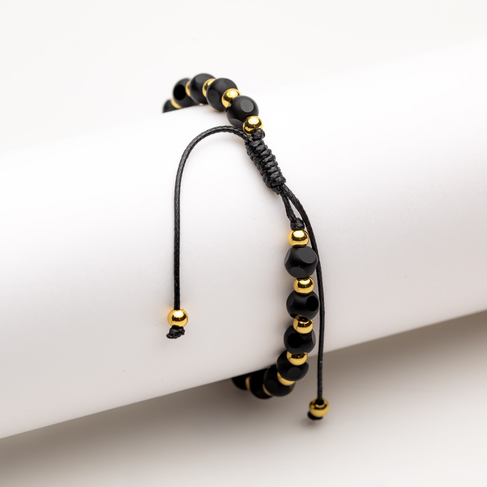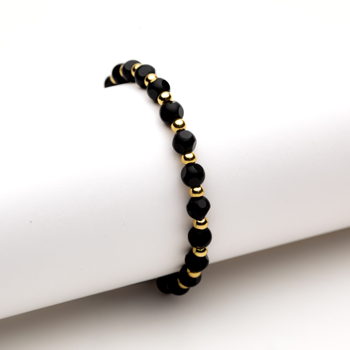 Brățară Reglabilă Handmade Simplă Mila - Eleganță Sofisticată și Simplitate Cuceritoare - realizată din cristale negre fațetate cu forme geometrice și bile placate cu aur galben de 14 K.