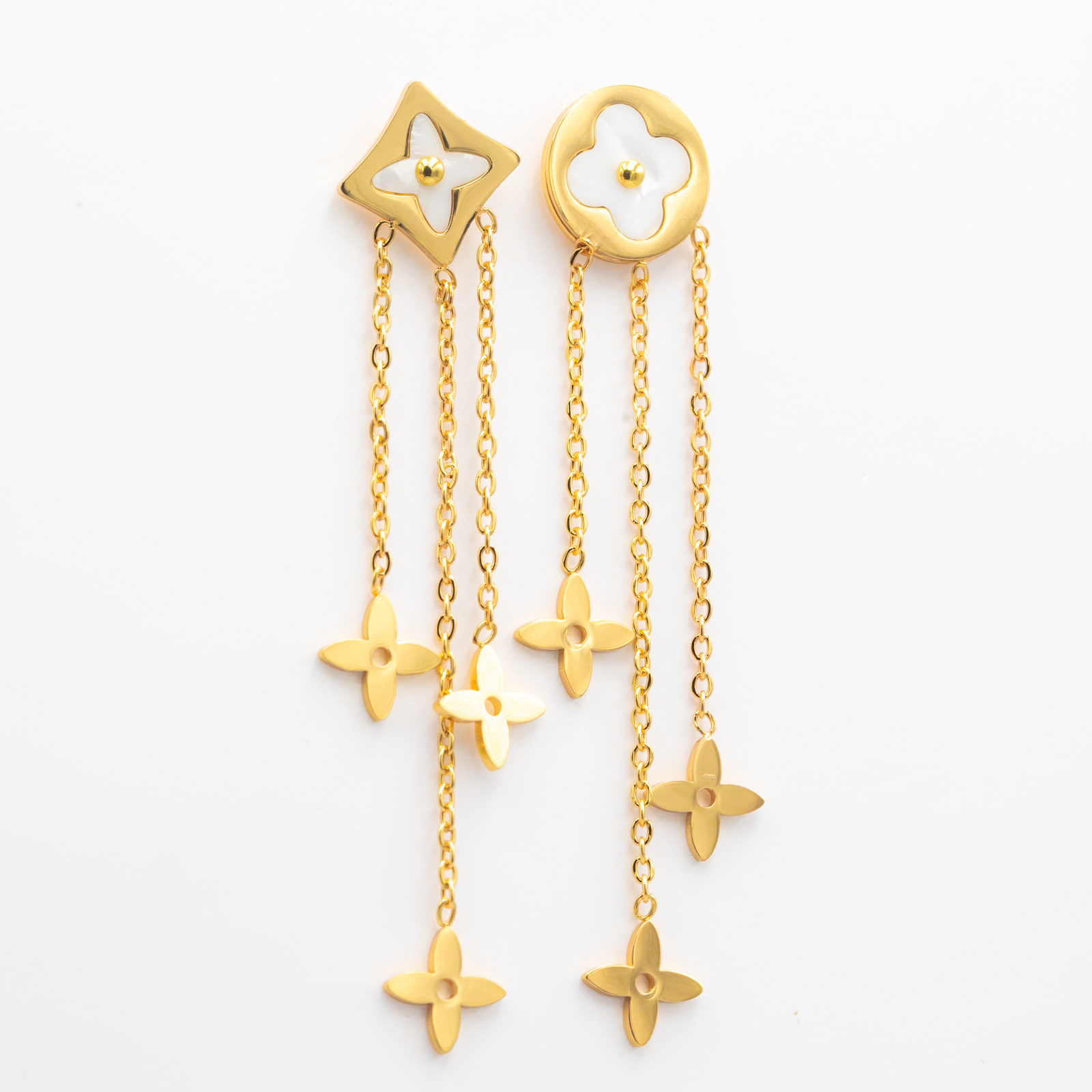 Cercei Lungi Și Aurii Alhambra - Design Fresh și Vibrații Norocoase- realizați din aliaj metalic placat cu aur galben de 14K și cu inserții de sidef alb.