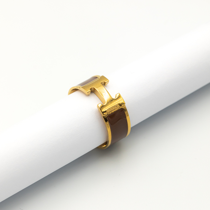 Inel Hermina Cappuccino Placat Cu Aur Galben Carla – Nuanțe Calde + Eleganță Modernă + Accente Neutre – realizat din aliaj metalic de înaltă calitate, placat cu aur galben de 14K și decorat cu inserții maro cappuccino lucioase.