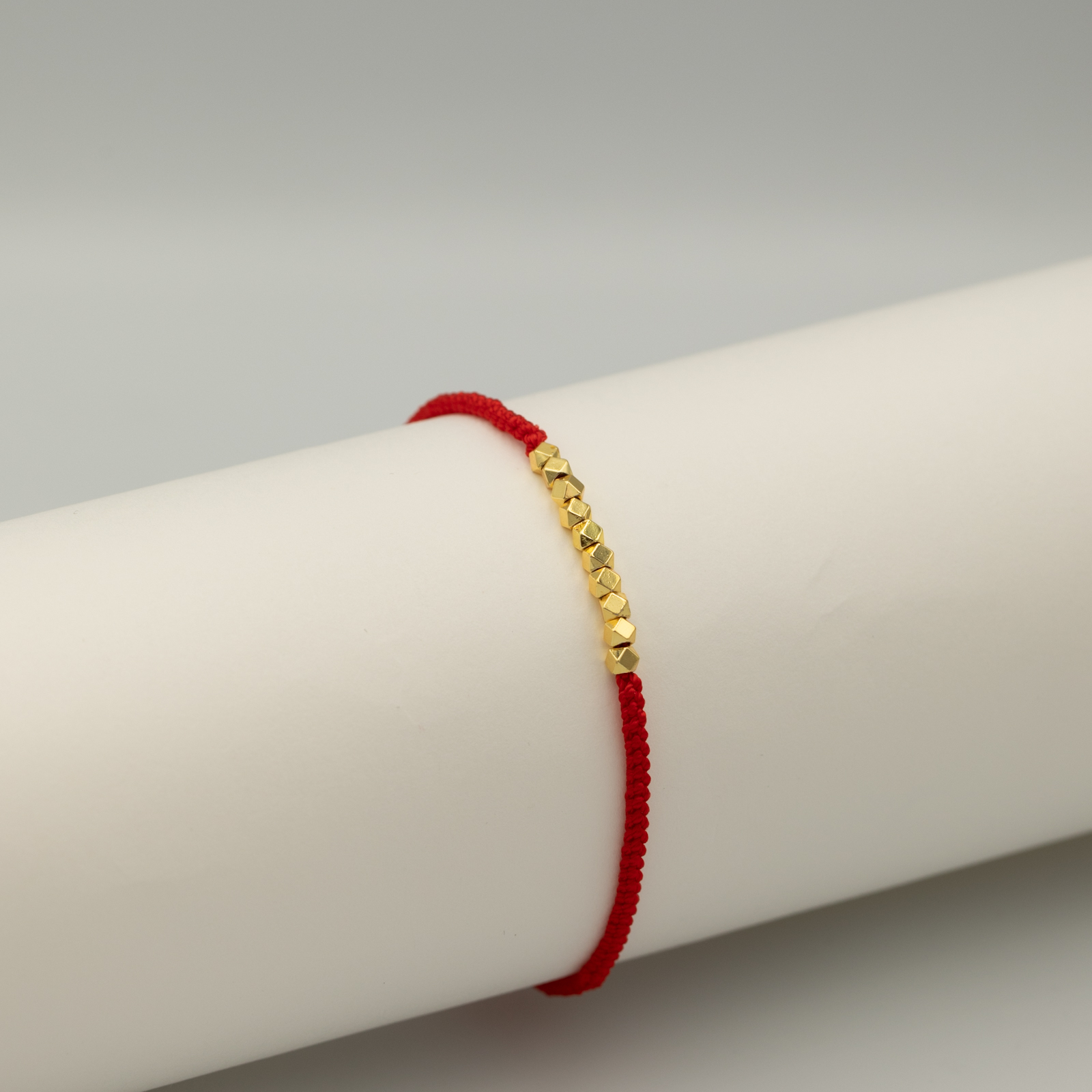 Brățară Reglabilă Handmade cu Biluțe Geometrice Aurii – Energie Modernă și Minimalism Elegant – ață de bumbac roșie și mărgele metalice aurii.