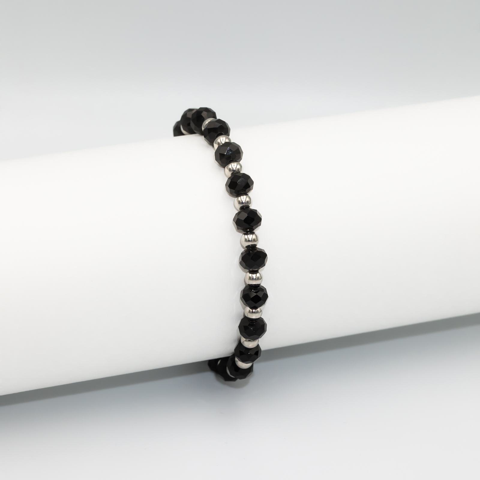 Brățară Handmade Reglabilă Cu Cristale Agnes – Eleganță Modernă și Minimialism Urban - realizată din cristale negre fațetate și biluțe din argint, montate pe sistem reglabil.