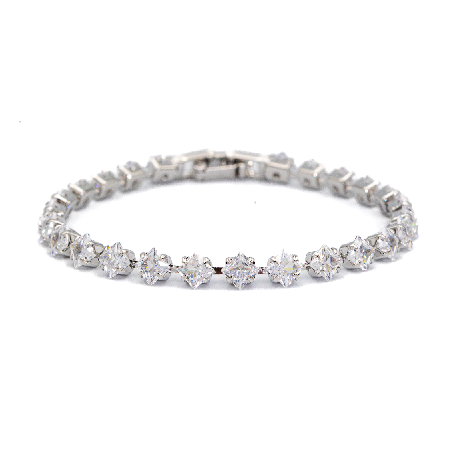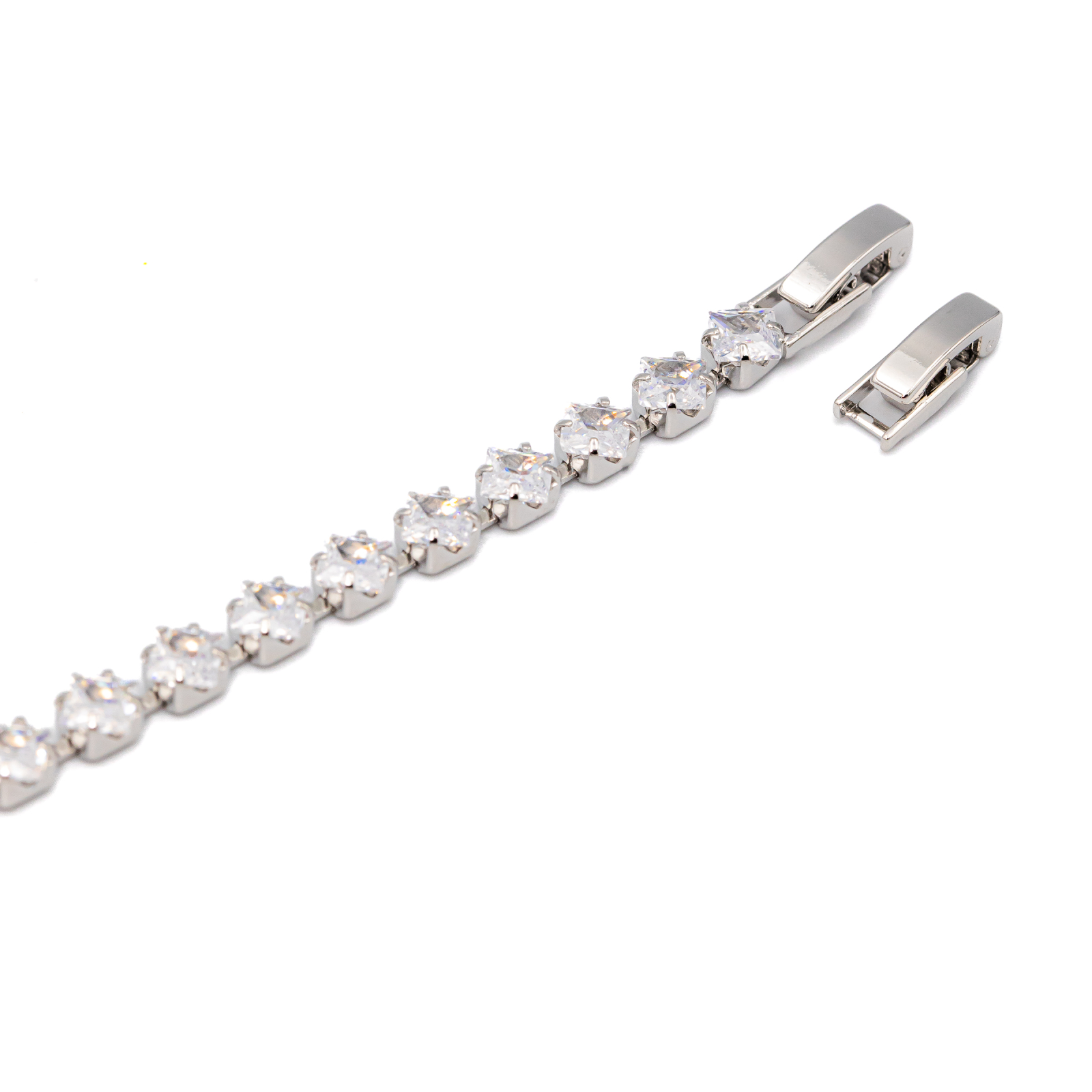 Brățară Tennis Silver Shine – Strălucire Modernă + Montură Patrata + Eleganță Contemporană – realizată din aliaj metalic de înaltă calitate placat cu aur alb de 14K și împodobită cu cristale zirconia transparente.