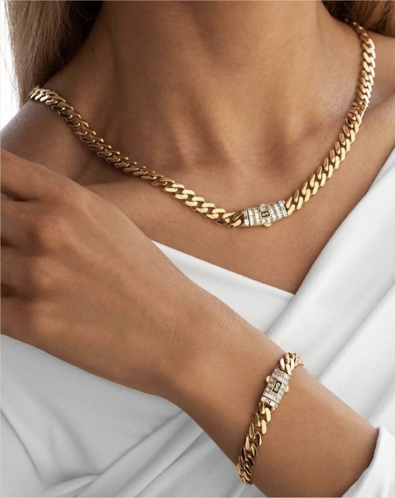 Set Placat Cu Aur Galben În Stil Monaco Colier Și Brățară - Opulență Seducătoare și Stil Iconic, Desăvârșit - realizat din colier și brățară din aliaj metalic placat cu aur galben de 14K, încrustate cu cristale zirconia strălucitoare și logo-ul brandului, un S pe fond negru, ce dă rafinament