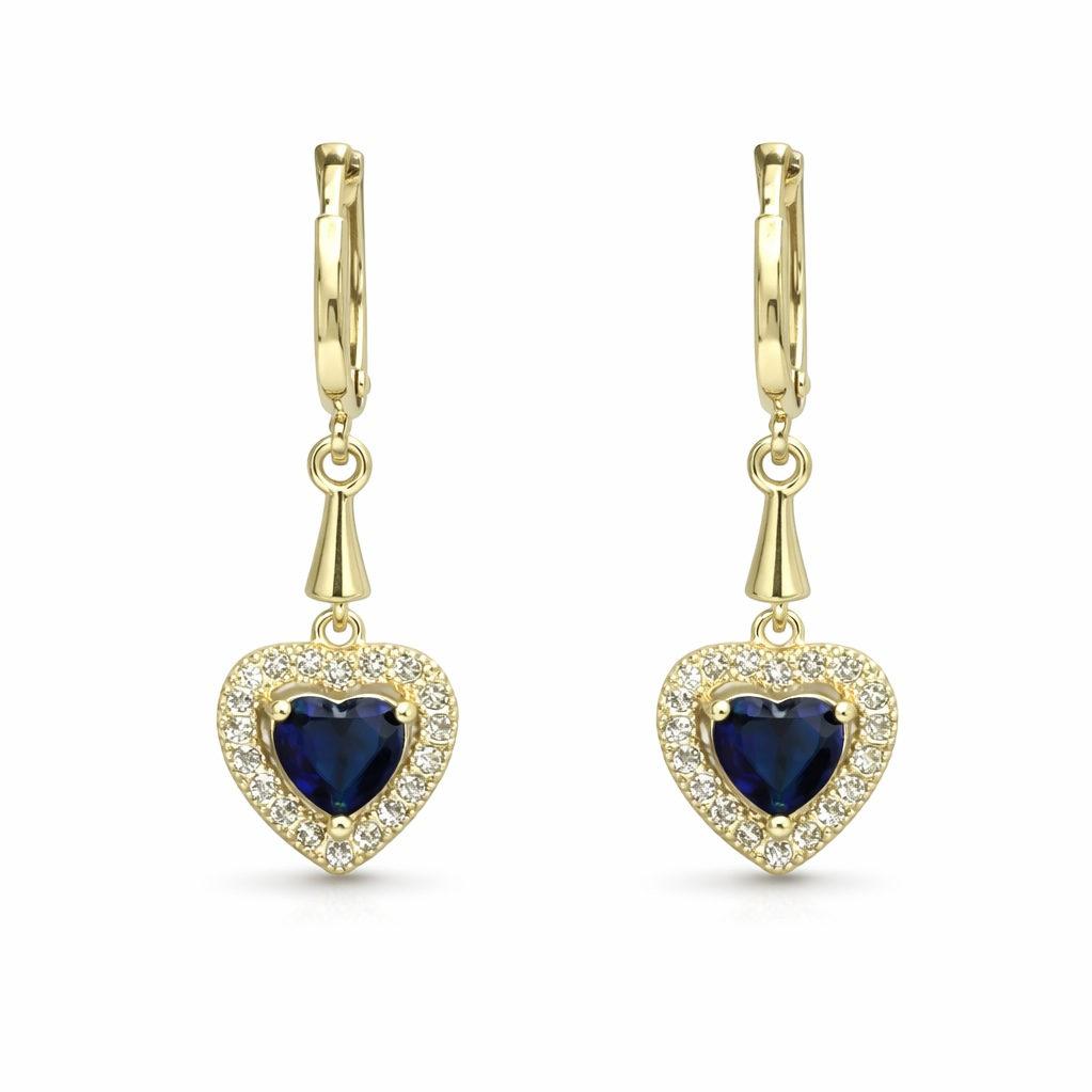 Cercei Stil Pandora Cu Piatră Albastru Navy – Rafinament Profund și Eleganță Atemporală – realizați din aliaj metalic placat cu aur galben de 14K, decorați cu cristale zirconia transparente și o piatră centrală albastru navy, tăiată în formă de inimă.