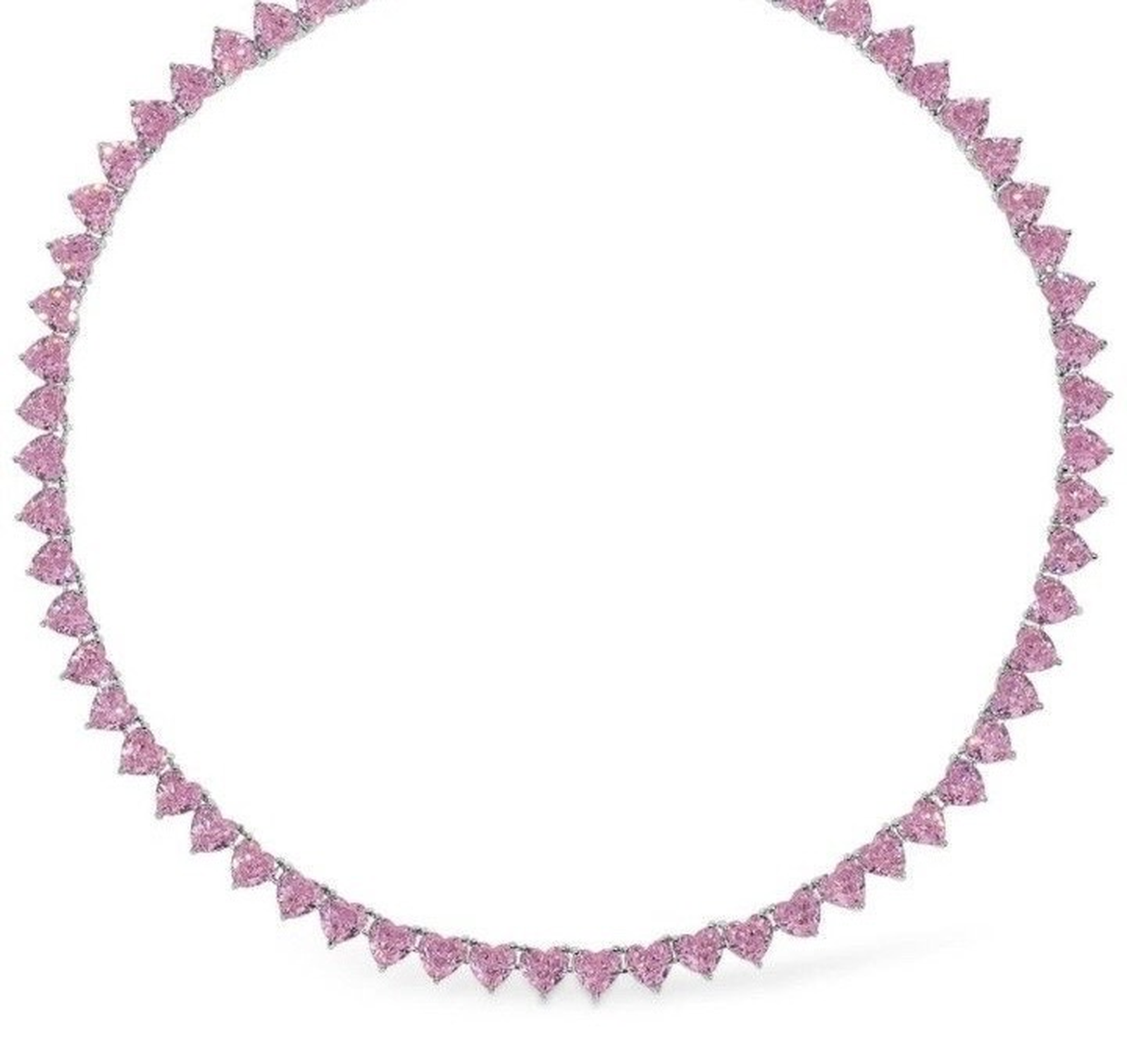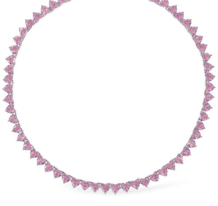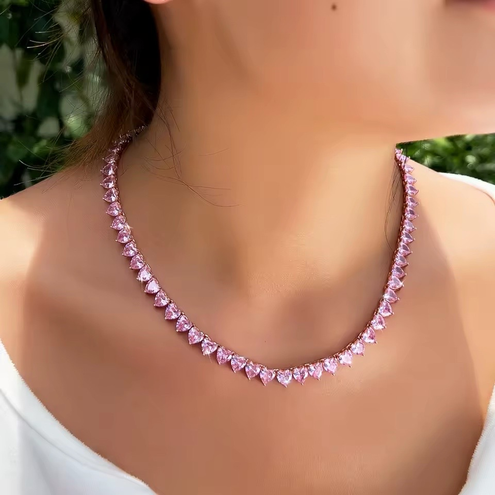 ​​​​​Colier Tennis Cu Cristale Roz Strălucitoare - Feminitate și Eleganță în Fiecare Detaliu - realizat dintr-un aliaj metalic de calitate superioară placat cu aur alb de 14K, cu design clasic tip Tennis, prevăzut cu un șirag continuu de cristale roz în formă de inimă.
