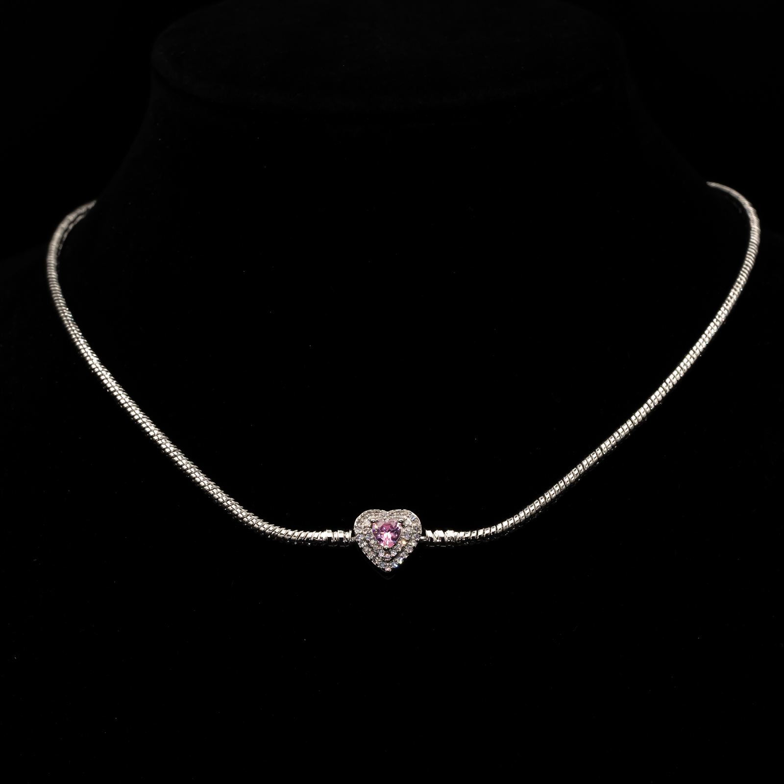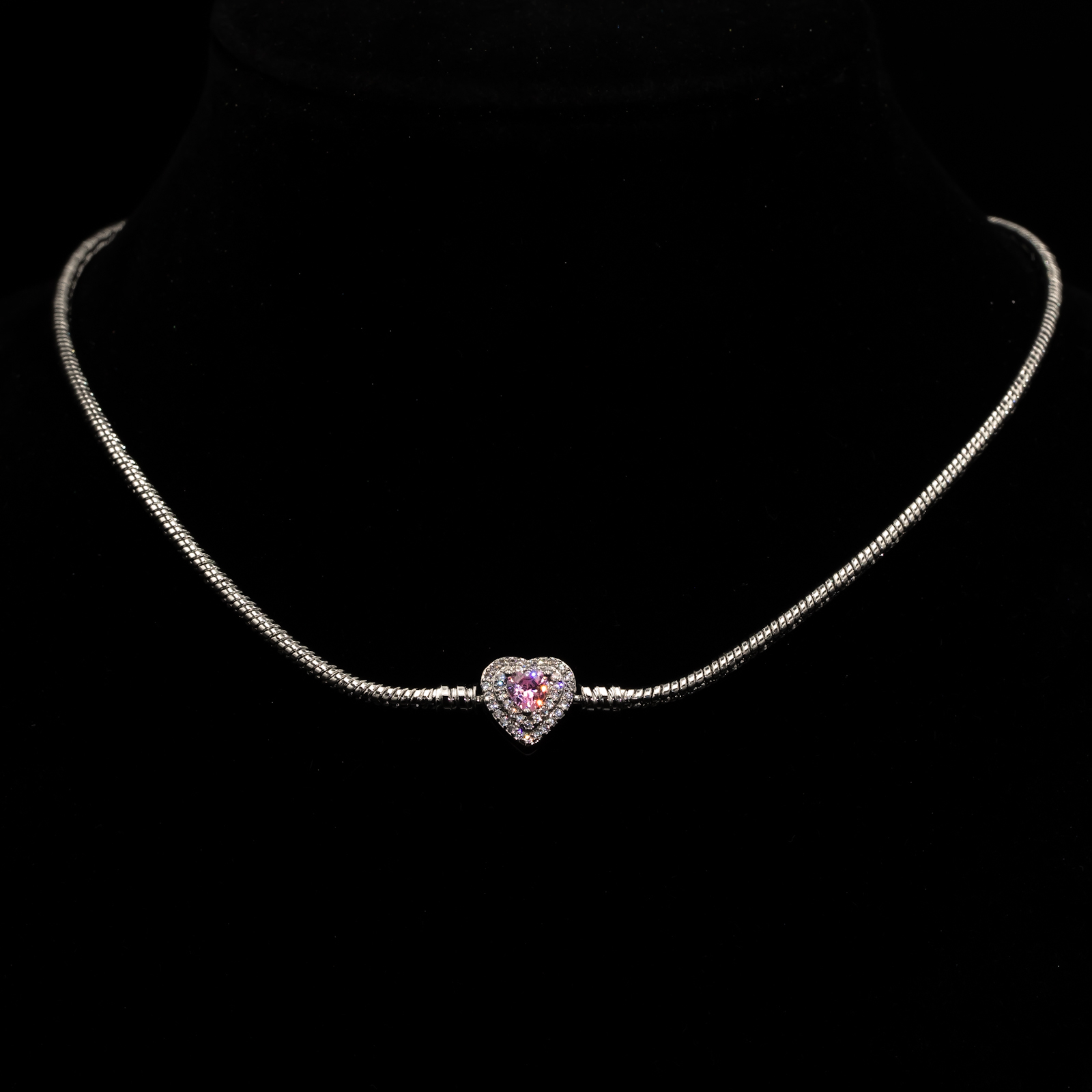 Colier Argintiu Stil Pandora Cu Pandantiv Inimă Pink Love – Vibrații Romantice și Delicatețe Glam – realizat din aliaj metalic placat cu aur alb de 14K, cu pandantiv în formă de inimă cu cristale zirconia încastrate și cristal roz central.