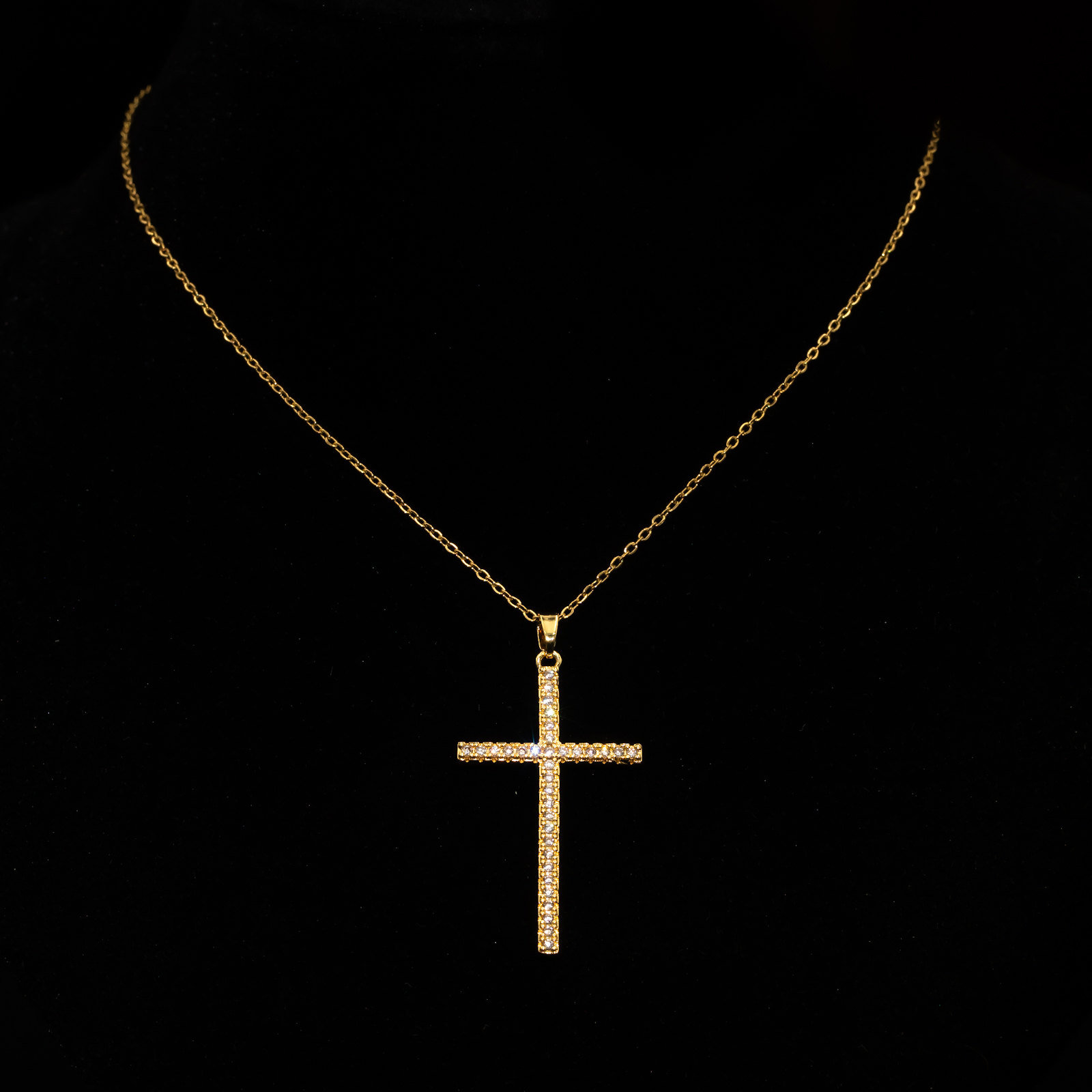 Colier Auriu Cu Pandantiv Cruce Și Cristale Zirconia – Semnificații Profunde și Emoție Caldă – realizat din aliaj metalic placat cu aur galben de 14K, cu pandantiv în formă de cruce încrustat cu cristale zirconia strălucitoare