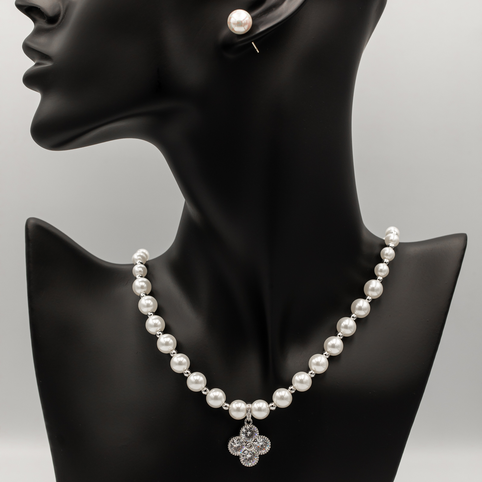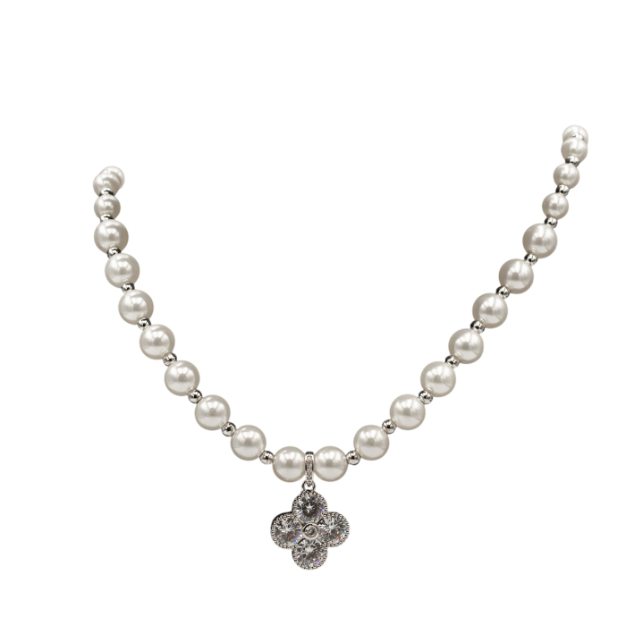 Colier De Perle Placat Cu Aur Alb Cu Pandantiv Floare – Rafinament Pur și Strălucire Modernă – șir de perle albe naturale cu pandantiv placat cu aur alb de 14K și cristale zirconia strălucitoare.