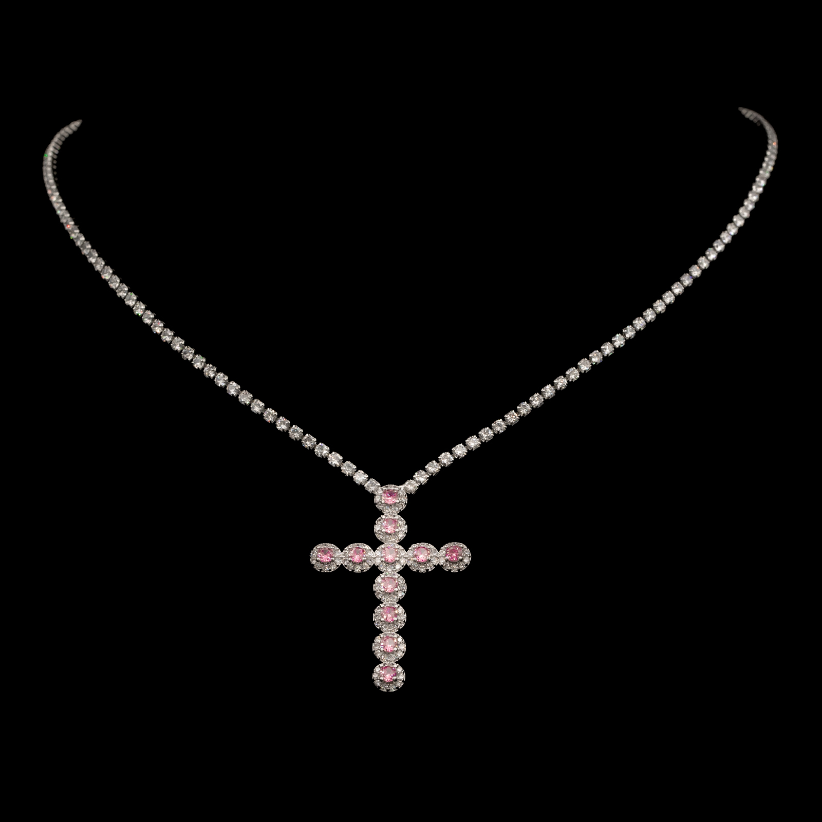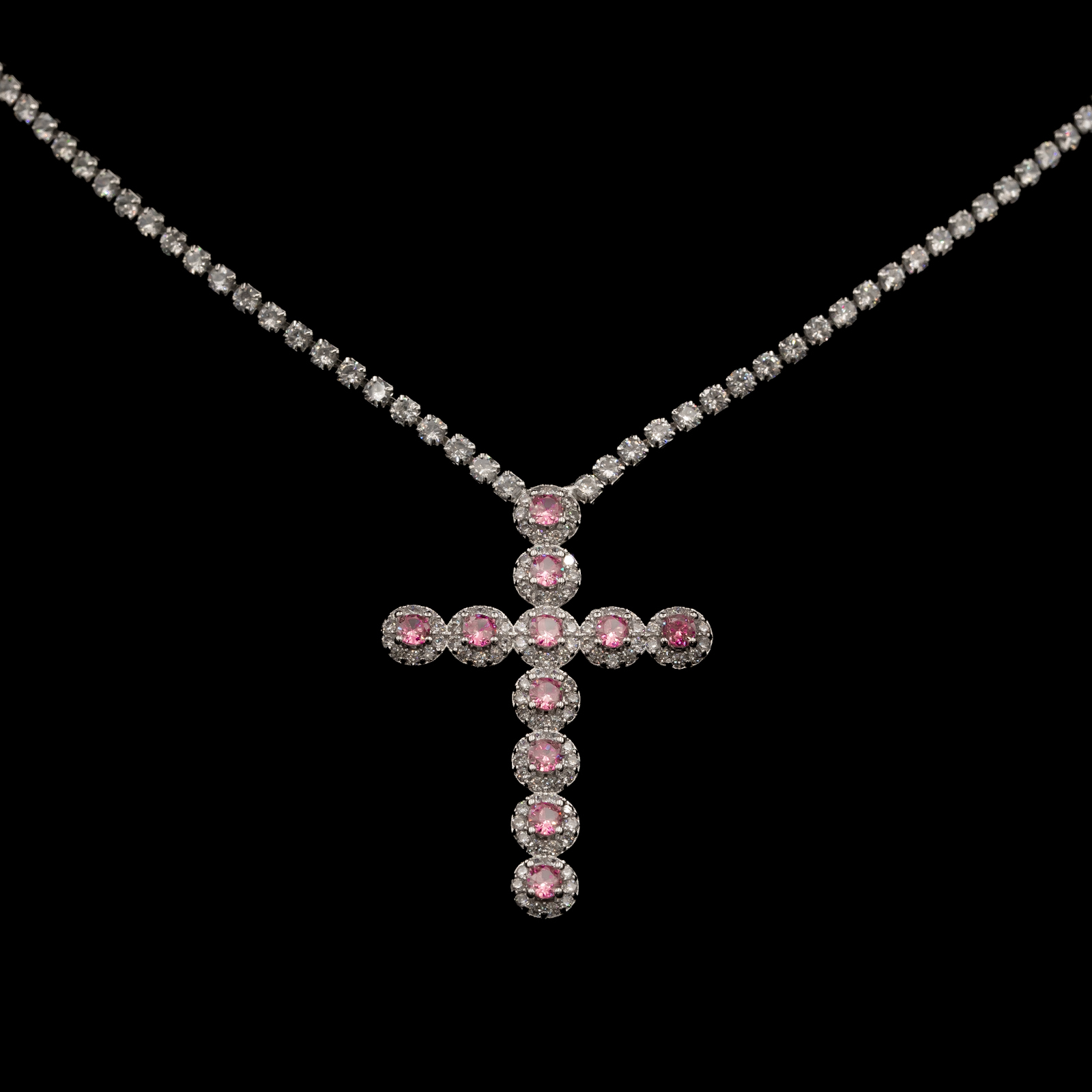 Colier Tennis Cu Pandantiv Cruce Cu Cristale Roz