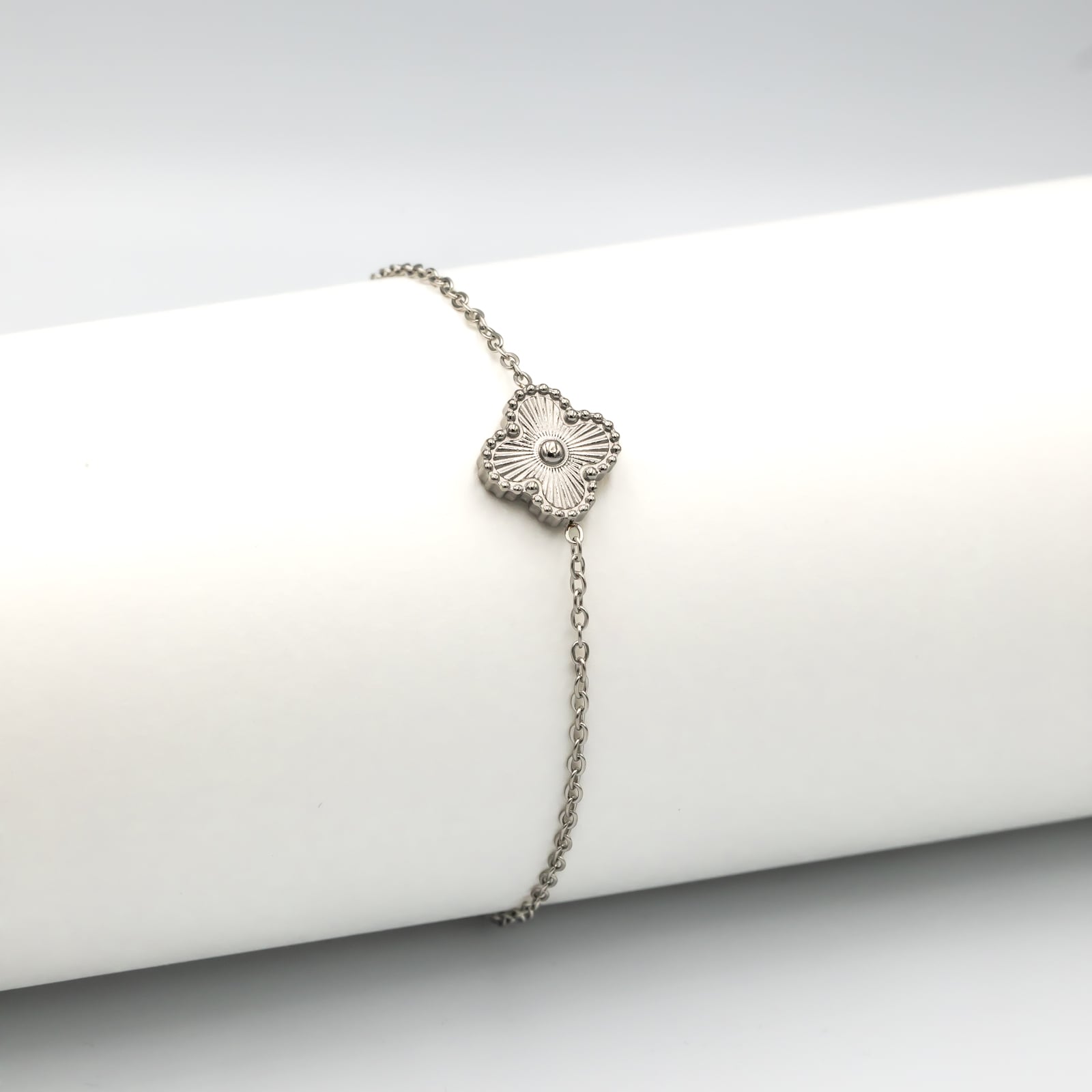 Brățară Alhambra cu Pandantiv Floare Silver – Eleganță Discretă și Strălucire Modernă – realizată din aliaj metalic placat cu aur alb de 14 K, cu pandantiv floare Alhambra într-o nuanță rece, sofisticată. Dimensiune: Brățara are o lungime de 19 cm și este completată de un lănțișor reglabil de 5 cm, pentru o purtare confortabilă și adaptabilă.