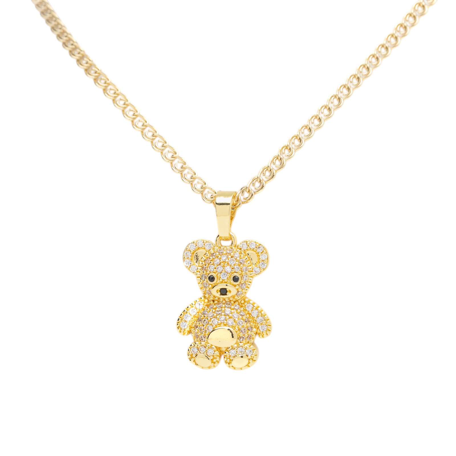 Colier cu pandantiv Teddy Glam placat cu Aur Galben Și Zirconia Cubică - Accent Plin de Viață și Modă cu Mesaj - realizat din aliaj metalic placat cu aur galben de 14K, cu un pandantiv statement, în forma unui ursuleț de pluș drăgălaș, cu detaliile feței migălos nuanțate, înfrumusețat de pietre Zirconia cubice.