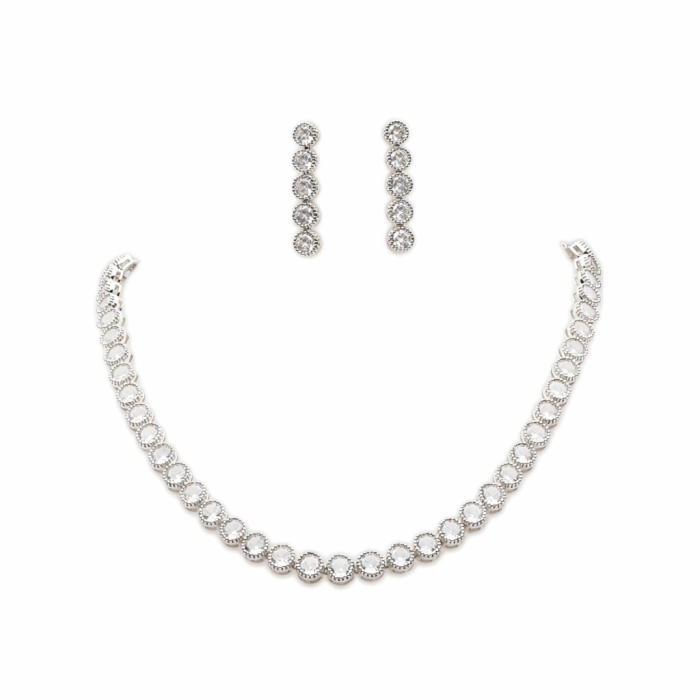 • Design unic: Strălucirea cristalelelor Zirconia și placarea cu aur alb de 14K fac din acest set un accesoriu deosebit, care atrage toate privirile.